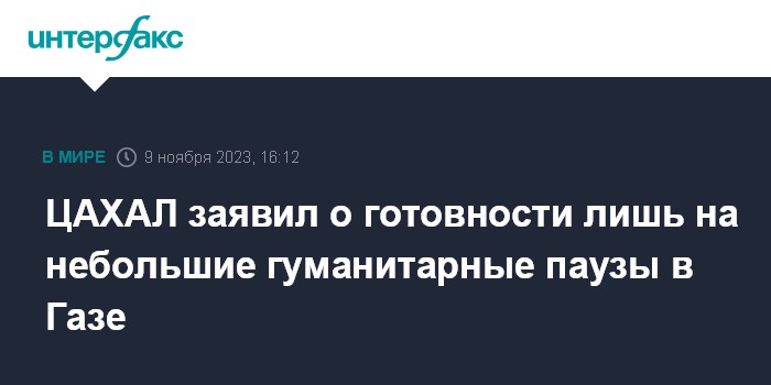 "Прекращения огня не будет. Есть тактические, локальные паузы для поставки гуманитарной помощи жителям Газы. Эти гуманитарные паузы ограничены по времени и площади", - говорится в заявлении ЦАХАЛ в соцсети.