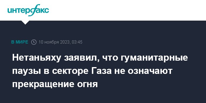 Москва. 10 ноября. INTERFAX.RU - Договоренность о ежедневных четырехчасовых паузах в боевых действиях в секторе Газа не означает полное прекращение огня, заявил премьер-министр Израиля Биньямин Нетаньяху.