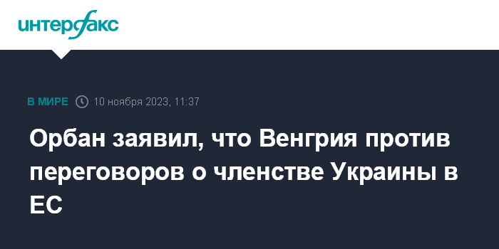 Москва. 10 ноября. INTERFAX.RU - Венгерский премьер Виктор Орбан в пятницу заявил, что Будапешт выступает против старта переговоров о вступлении Украины в ЕС, и данная позиция не является предметом торга в связи с заморозкой Брюсселем средств из фондов ЕС для Венгрии.