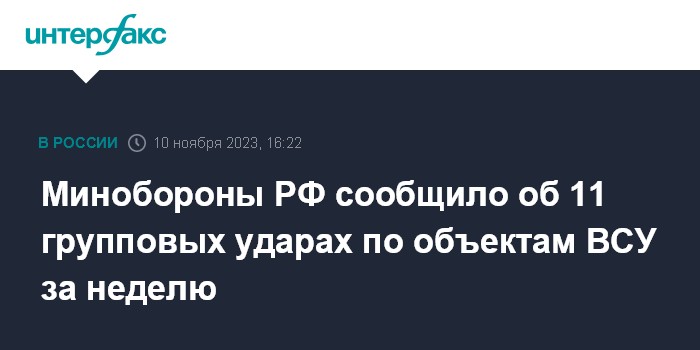 Москва. 10 ноября. INTERFAX.RU - Российские военные заявили, что за неделю нанесли 11 групповых ударов высокоточным оружием, беспилотниками по военным объектам Украины, отметили, что все назначенные цели поражены.