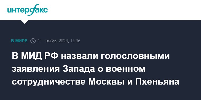 Москва. 11 ноября. INTERFAX.RU - Обвинения Запада в "незаконном" военно-техническом сотрудничестве России с КНДР голословны и бездоказательны, "в излюбленном стиле highly likely", сообщили в МИД РФ.