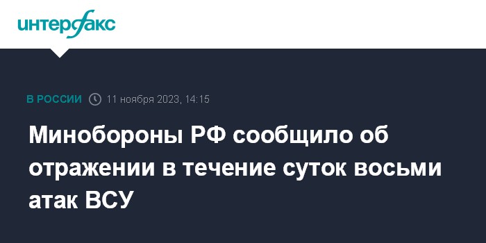 Минобороны РФ сообщило об отражении в течение суток восьми атак ВСУ