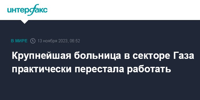 Москва. 13 ноября. INTERFAX.RU - Крупнейшая в секторе Газа больница Аль-Шифа практически прекратила работу из-за отсутствия топлива, сообщил арабским СМИ ее директор Мухаммад Абу Салмия.