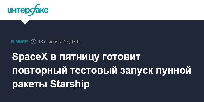 Москва. 13 ноября. INTERFAX.RU - Повторный испытательный запуск в орбитальный полет сверхтяжелой ракеты Starship, создаваемой для пилотируемых миссий на Луну и Марс, планируется предпринять 17 ноября, сообщает компания-разработчик SpaceX.