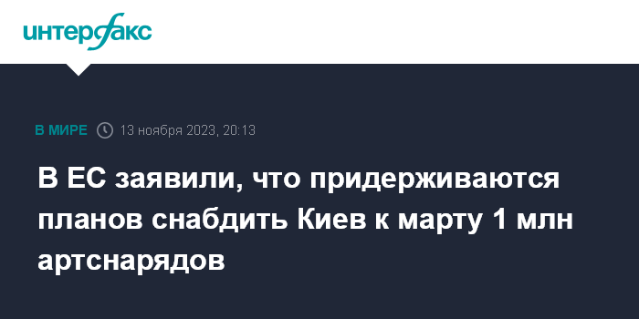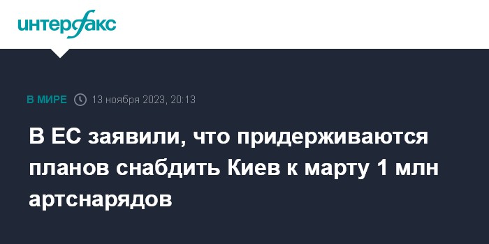 Москва. 13 ноября. INTERFAX.RU - Евросоюз не отказался от цели поставить Украине к марту 2024 года 1 млн боеприпасов для артиллерии, заявил в понедельник глава дипломатии ЕС Жозеп Боррель.