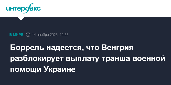 Москва. 14 ноября. INTERFAX.RU - Глава дипломатии ЕС Жозеп Боррель рассчитывает, что очередная встреча венгерской и украинской сторон по вопросу выделения восьмого транша военной помощи Евросоюза Киеву поможет снять возражения Будапешта.