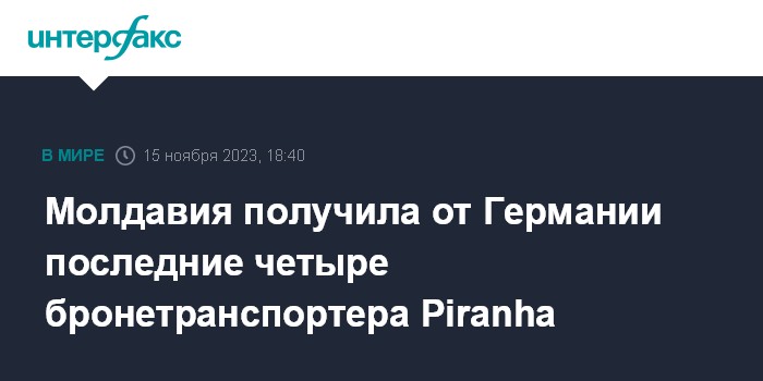 Москва. 15 ноября. INTERFAX.RU - Молдавия получила последние четыре бронетранспортера Piranha-3 H из партии в 19 машин, которые безвозмездно выделила Германия.