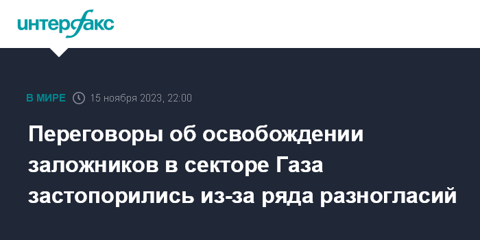 Москва. 15 ноября. INTERFAX.RU - Переговоры об освобождении заложников в секторе Газа, проводимые Израилем и группировкой ХАМАС при посредничестве Катара, перешли в кризисную стадию из-за ряда разногласий. Об этом сообщает Haaretz со ссылкой на арабские и палестинские источники.