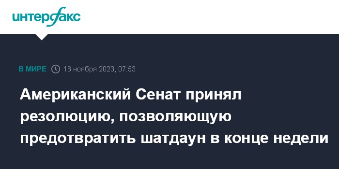 Москва. 16 ноября. INTERFAX.RU - Сенат США одобрил законопроект о сокращении расходов, которой позволяет сохранить финансирование правительства и предотвратить его закрытие (шатдаун) в конце недели, сообщили американские СМИ.