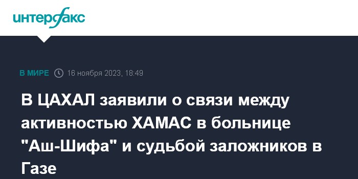 Москва. 16 ноября. INTERFAX.RU - В Армии обороны Израиля (ЦАХАЛ) заявили, что военные имеют сведения о связи между деятельностью группировки ХАМАС на территории больницы "Аш-Шифа", где идет рейд израильских военных, и заложниками, захваченными членами ХАМАС в ходе нападения 7 октября.