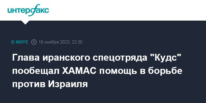 Москва. 16 ноября. INTERFAX.RU - Иран сделает все необходимое, чтобы помочь группировке ХАМАС в ее противостоянии с Израилем, заявил командующий спецподразделением "Кудс" Корпуса стражей Исламской революции (КСИР) бригадный генерал Эсмаил Каани.