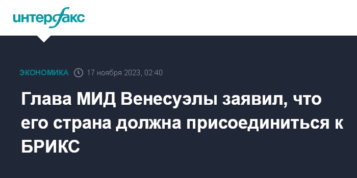 Москва. 17 ноября. INTERFAX.RU - Венесуэла рассчитывает продвинуться в вопросе вступления в БРИКС при председательстве РФ в 2024 году, заявил министр иностранных дел республики Иван Хиль Пинто.
