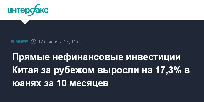 Прямые нефинансовые инвестиции Китая за рубежом выросли на 17,3% в юанях за 10 месяцев
