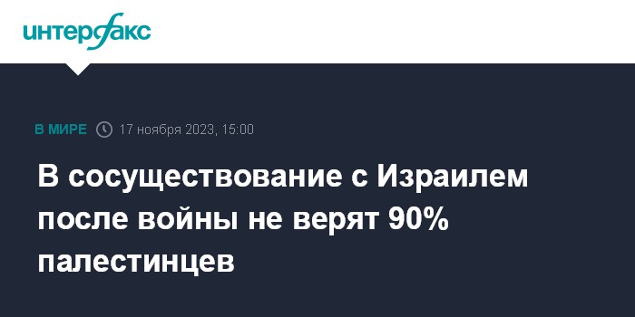 Москва. 17 ноября. INTERFAX.RU - В шансы на мирное сосуществование с Израилем после войны не верят 90% палестинцев, 98% говорят, что никогда не забудут и не простят то, что делает Израиль, теракты 7 октября одобряют 59%, показал опрос, который "Арабский мир исследований и развития" (AWRAD) провел в секторе Газа и на Западном берегу Иордана.