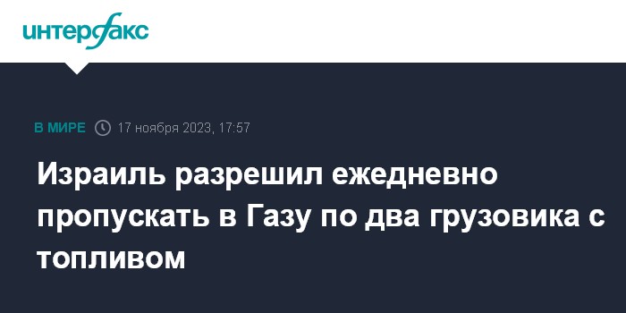 Москва. 17 ноября. INTERFAX.RU - Израиль одобрил ежедневную отправку в сектор Газа для нужд ООН двух грузовиков с топливом, сообщает в пятницу Haaretz со ссылкой на осведомленный источник.