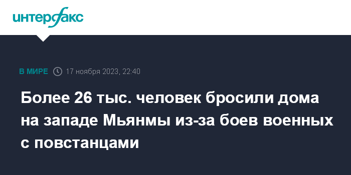 Москва. 17 ноября. INTERFAX.RU - Свыше 26 тыс. человек покинули свои дома из-за боев между военными Мьянмы и повстанцами "Армии Аракана" в штате Ракхайн на западе страны, сообщили в Управлении ООН по координации гуманитарных вопросов (УКГВ).