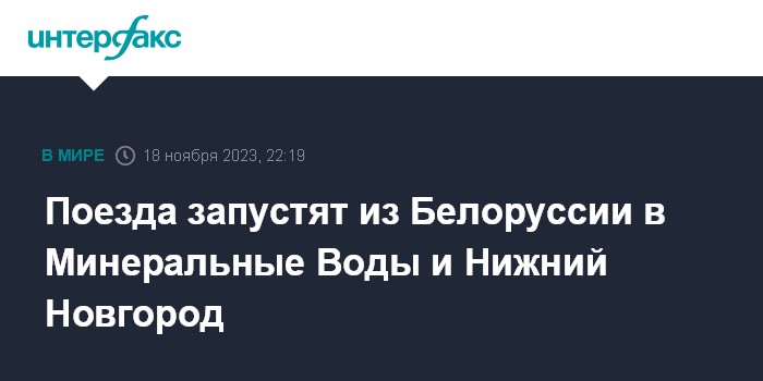 Москва. 18 ноября. INTERFAX.RU - Белоруссия открывает железнодорожное сообщение с Минеральными Водами и Нижним Новгородом, заявил глава Минтранса республики Алексей Ляхнович в субботу в эфире гостелеканала "Беларусь 1".