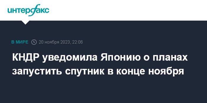 Москва. 20 ноября. INTERFAX.RU - Северная Корея проинформировала Токио о планах провести в ближайшие дни запуск ракеты-носителя со спутником, передает в понедельник телеканал NHK со ссылкой на береговую охрану Японии.