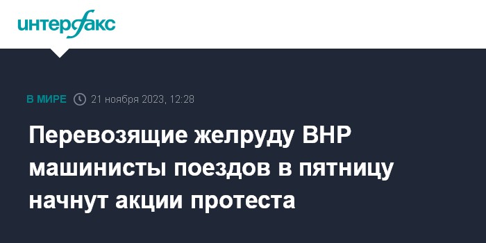 Москва. 21 ноября. INTERFAX.RU - Машинисты поездов, перевозящих железную руду австралийского горнодобывающего гиганта BHP Group, в пятницу начнут акции протеста, направленные на достижение нового трудового соглашения с компанией. Об этом говорится в сообщении представляющего их интересы профсоюза Mining & Energy Union (MEU).