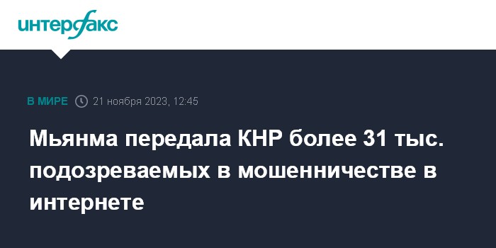 Москва. 21 ноября. INTERFAX.RU - Власти Мьянмы передали властям КНР свыше 31 тыс. подозреваемых в интернет-мошенничестве, которое преступные группировки организовали в широких масштабах на приграничной с Китаем мьянманской территории, сообщает телеканал Channel NewsAsia.