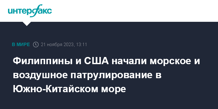 Москва. 21 ноября. INTERFAX.RU - Военные Филиппин и США со вторника приступили к совместному патрулированию западной части акватории Южно-Китайского моря и воздушного пространства в этом районе, заявил филиппинский президент Фердинанд Маркос-младший.
