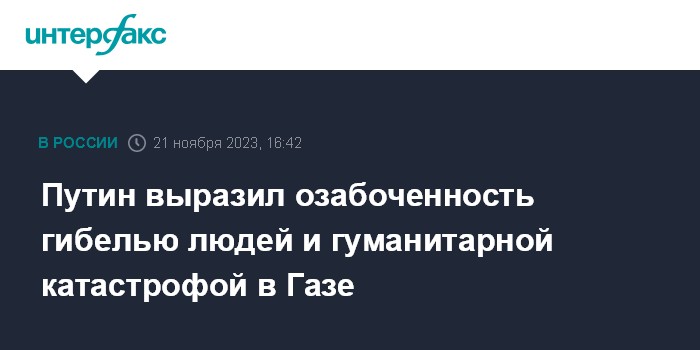 Москва. 21 ноября. INTERFAX.RU - Президент РФ Владимир Путин заявил, что ситуация в секторе Газа является гуманитарной катастрофой, которая вызывает глубочайшую озабоченность.