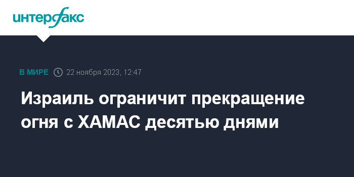 Москва. 22 ноября. INTERFAX.RU - Израиль согласен на максимум десять дней прекращения огня в секторе Газа, и этот срок будет отсчитываться с момента освобождения первых заложников, следует из опубликованного документа правительства страны. Об этом сообщает The Times of Israel.