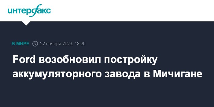 Москва. 22 ноября. INTERFAX.RU - Американский автопроизводитель Ford Motor возобновил строительство предприятия по выпуску аккумуляторов для электромобилей в Маршалле (штат Мичиган), которое было приостановлено два месяца назад из-за забастовки профсоюза работников автомобильной промышленности, пишет MarketWatch.