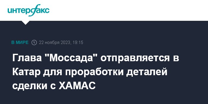 Москва. 22 ноября. INTERFAX.RU - Директор разведслужбы Израиля "Моссад" Давид Барнеа в среду вечером посетит Катар для обсуждения окончательных деталей сделки по освобождению заложников между Израилем и ХАМАС, сообщает The Times of Israel.