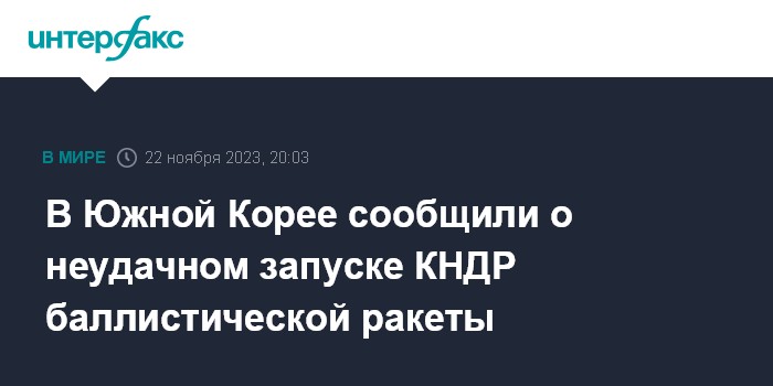 Москва. 22 ноября. INTERFAX.RU - Северная Корея осуществила попытку запуска баллистической ракеты, но потерпела неудачу, сообщает в среду агентство "Рёнхап" со ссылкой на данные южнокорейских военных.