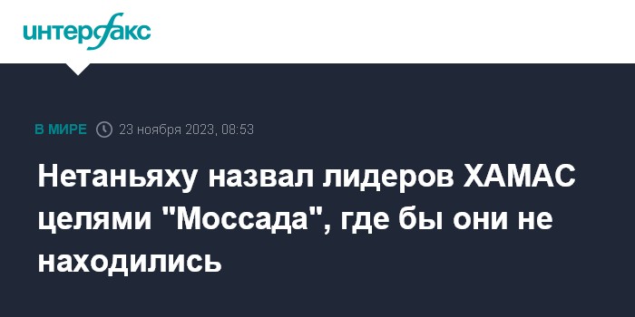 Москва. 23 ноября. INTERFAX.RU - Премьер-министр Израиля Биньямин Нетаньяху поручил разведслужбе "Моссад" принимать меры против лидеров террористической группировки ХАМАС, где бы те ни находились. Как пишет Jerusalem Post, премьер сообщил об этом журналистам.