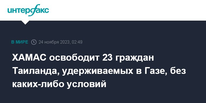 "ХАМАС (...) также освободит 23 тайских заложника, удерживаемых в Газе, без каких-либо условий, согласно достигнутой при посредничестве Ирана договоренности между (...) палестинской группировкой и правительством Таиланда", - сообщает газета.