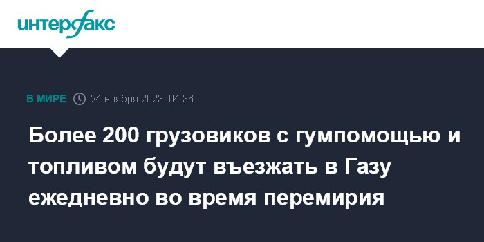 Москва. 24 ноября. INTERFAX.RU - В сектор Газа во время четырехдневного перемирия, которое начнется в пятницу утром, будут ежедневно въезжать свыше 200 грузовиков с гуманитарной помощью и топливом, пишет The Times of Israel со ссылкой на главу госинформслужбы Египта Диаа Рашвана.