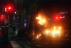 По его словам, хулиганы разграбили 13 магазинов, повредили три автобуса, один трамвай и 11 полицейских машин.