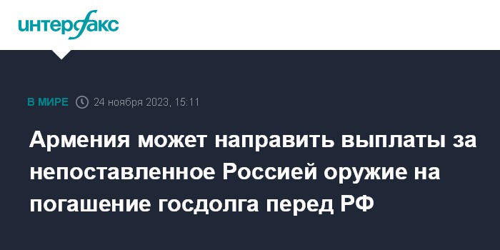 Москва. 24 ноября. INTERFAX.RU - Сумма, выплаченная за российское оружие, которое не было доставлено в Армению, может пойти на погашение государственного долга страны перед Россией, сообщил в пятницу премьер-министр Армении Никол Пашинян.
