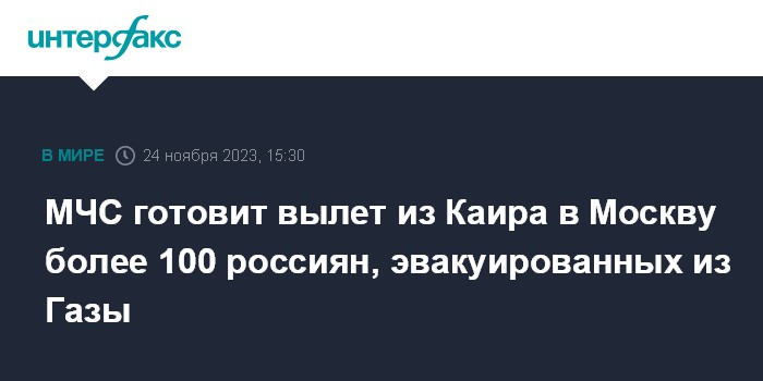 Москва. 24 ноября. INTERFAX.RU - МЧС России доставит в Москву еще свыше 100 граждан РФ и членов их семей, эвакуированных из зоны палестино-израильского конфликта.