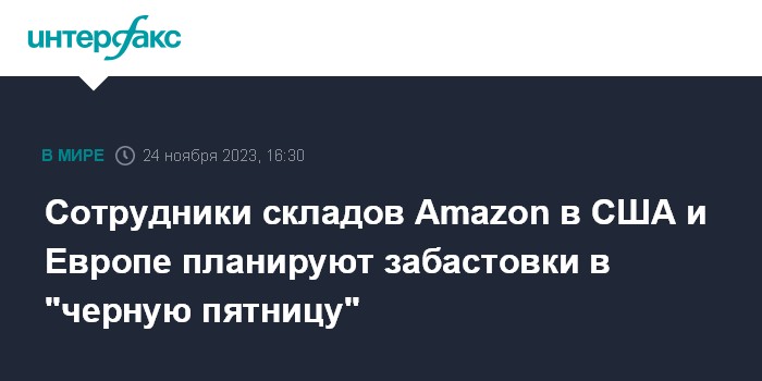 Москва. 24 ноября. INTERFAX.RU - Работники складов и водители Amazon.com Inc. в США, Великобритании, Германии, Италии и Испании планируют провести забастовки в "черную пятницу" с требованием повышения зарплат и улучшения условий труда, говорится в заявлении международной федерации профсоюзов UNI Global Union.
