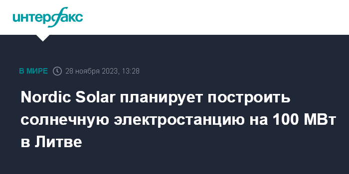 Москва. 28 ноября. INTERFAX.RU - Датская энергокомпания Nordic Solar, занимающаяся развитием солнечной энергетики, планирует построить в Литве гелиоэлектростанцию мощностью 100 МВт, говорится в сообщении компании.