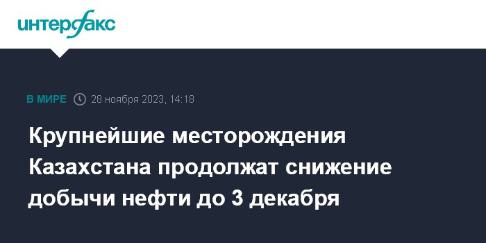 Москва. 28 ноября. INTERFAX.RU - Крупнейшие месторождения Казахстана - Тенгиз, Карачаганак и Кашаган - продолжат снижать добычу нефти вплоть до 3 декабря, свидетельствуют данные Минэнерго Казахстана.