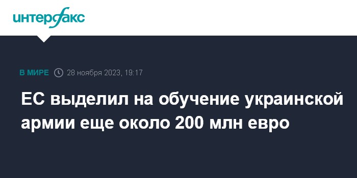 Москва. 28 ноября. INTERFAX.RU - Совет ЕС принял во вторник решение предоставить дополнительное финансирование в 194 млн евро для обучения украинских военнослужащих в рамках миссии военной помощи Евросоюза Украине (EUMAM Ukraine).