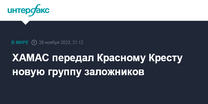 Москва. 28 ноября. INTERFAX.RU - Палестинское движение ХАМАС во вторник передало очередную группу заложников сотрудникам Международного комитета Красного Креста, сообщает The Wall Street Journal (WSJ) со ссылкой на египетских чиновников.