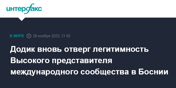 По данным телеканала, "Додик вновь озвучил четкую позицию руководства Республики Сербской, которое отрицает легитимность Кристиана Шмидта, как Высокого представителя международного сообщества в БиГ, поскольку его кандидатура при назначении не была утверждена в СБ ООН, как положено в соответствии с Дейтонскими мирными соглашениями, положившими в 1995 году конец гражданскому конфликту в Боснии и Герцеговине".