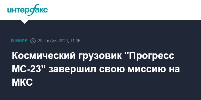 Москва. 29 ноября. INTERFAX.RU - Транспортный грузовой корабль "Прогресс МС-23" отстыковался от Международной космической станции (МКС) для последующего затопления в Тихом океане, следует из трансляции, которую ведет "Роскосмос".