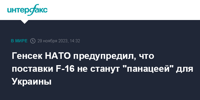 Москва. 29 ноября. INTERFAX.RU - Генсек НАТО Йенс Столтенберг заявил, что пока не может назвать конкретную дату поставки Украине истребителей F-16, но выразил надежду, что это произойдет как можно скорее; при этом он отметил, что истребители в случае с Украиной не стоит воспринимать как панацею.