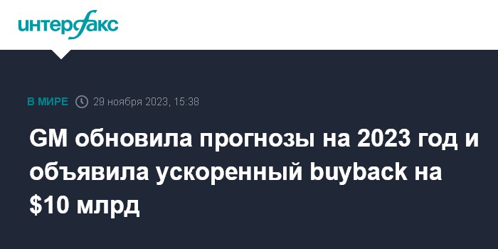 Москва. 29 ноября. INTERFAX.RU - General Motors Co. (GM) опубликовала новые прогнозы на 2023 год, а также объявила о запуске программы ускоренного обратного выкупа акций на сумму $10 млрд и намерении увеличить дивиденды на 33%.