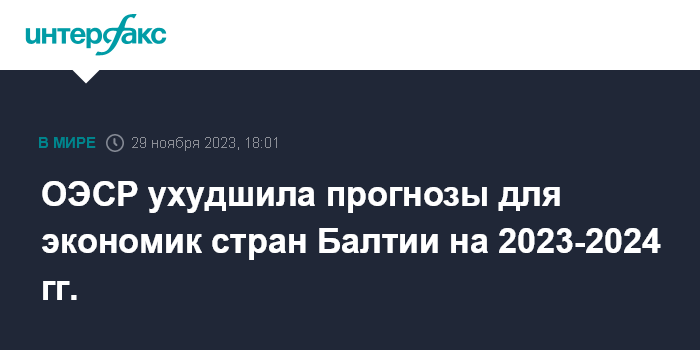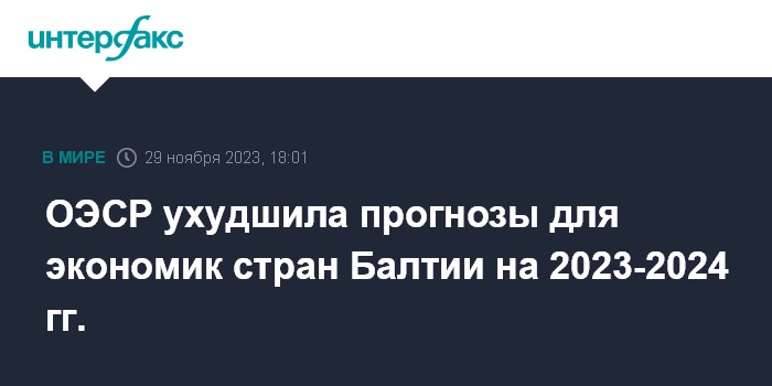 Москва. 29 ноября. INTERFAX.RU - Организация экономического сотрудничества и развития (ОЭСР) ухудшила прогнозы для экономик стран Балтии на 2023 год. Согласно обновленным оценкам, спад ВВП будет наблюдаться не только в Эстонии, но также в Латвии и Литве.