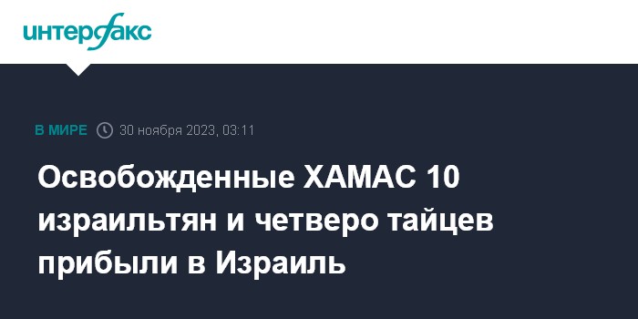 Москва. 30 ноября. INTERFAX.RU - Освобожденные в среду группировкой ХАМАС 10 израильтян уже находятся на территории Израиля, передает CNN.