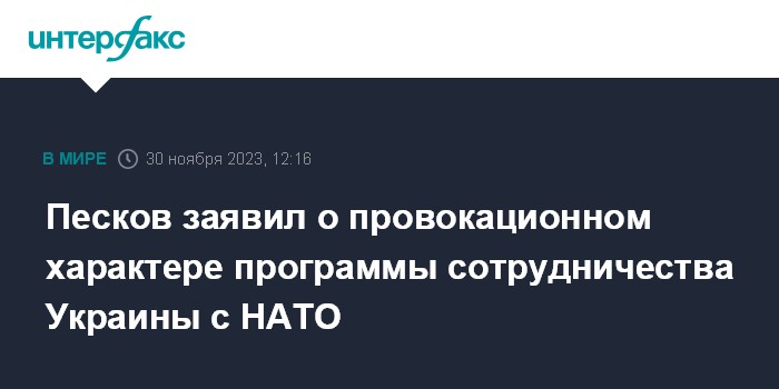 Москва. 30 ноября. INTERFAX.RU - Программа сотрудничества НАТО и Украины на 2024 год не содержит никаких новаций, но свидетельствует о продолжении альянсом провокационной политики, заявил пресс-секретарь президента РФ Дмитрий Песков.
