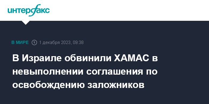 Москва. 1 декабря. INTERFAX.RU - Группировка ХАМАС не выполнила обязательства, взятые на себя в рамках соглашения о перемирии, которые касались освобождения заложников, заявили в офисе премьер-министра Израиля Биньямина Нетаньяху.