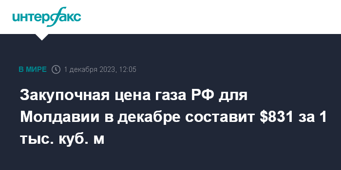 Москва. 1 декабря. INTERFAX.RU - Закупочная цена природного газа, поставляемого "Газпромом" в Молдавию, в декабре составит $831,04 за 1 тысячу кубометров, сообщил председатель правления "Молдовагаза" Вадим Чебан в своем телеграм-канале в пятницу.